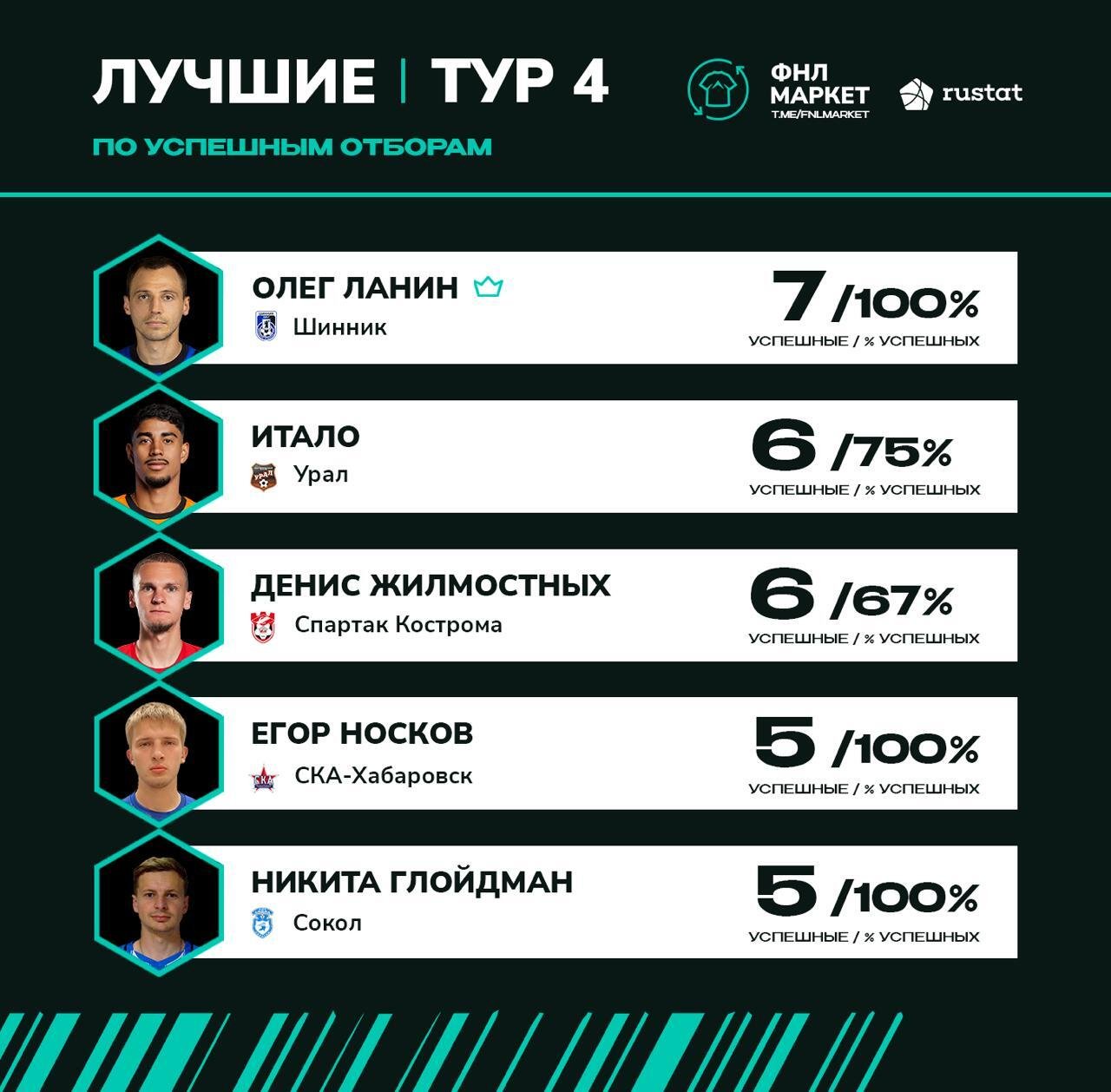 Футбольная национальная лига (ФНЛ) опубликовала рейтинг игроков четвёртого тура Лиги PARI по успешным отборам.