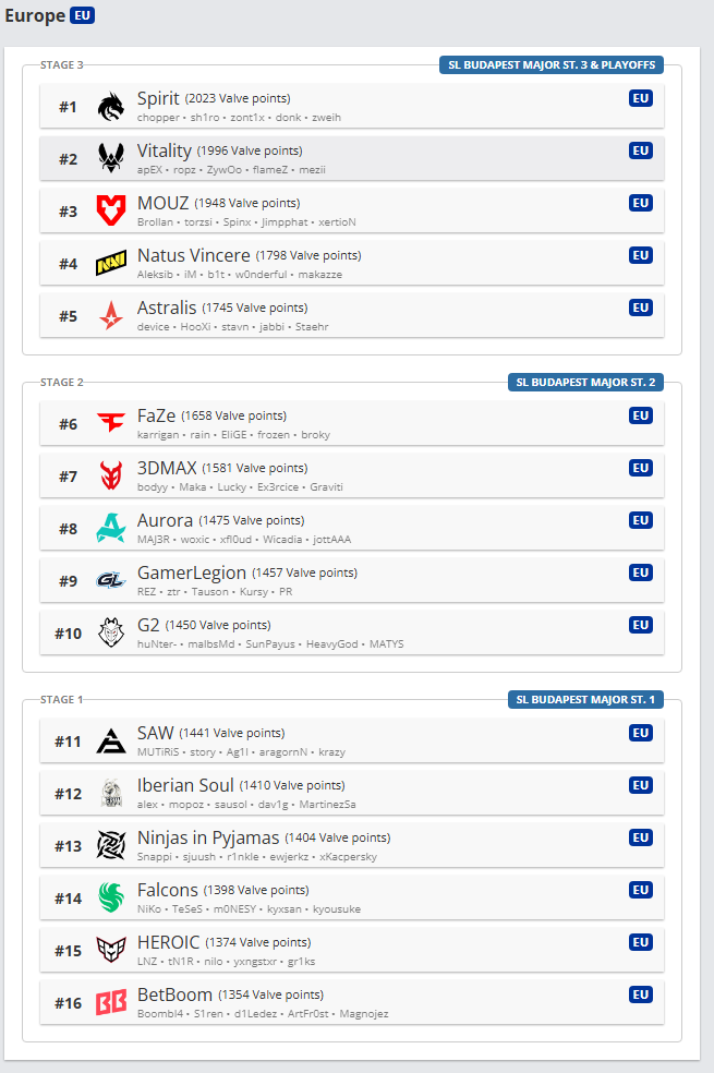 Если верить алгоритмам HLTV, то приглашение в Stage 1 из Европы получат: SAW, Iberian Soul, Ninjas in Pyjamas, Team Falcons, HEROIC И BetBom Team.