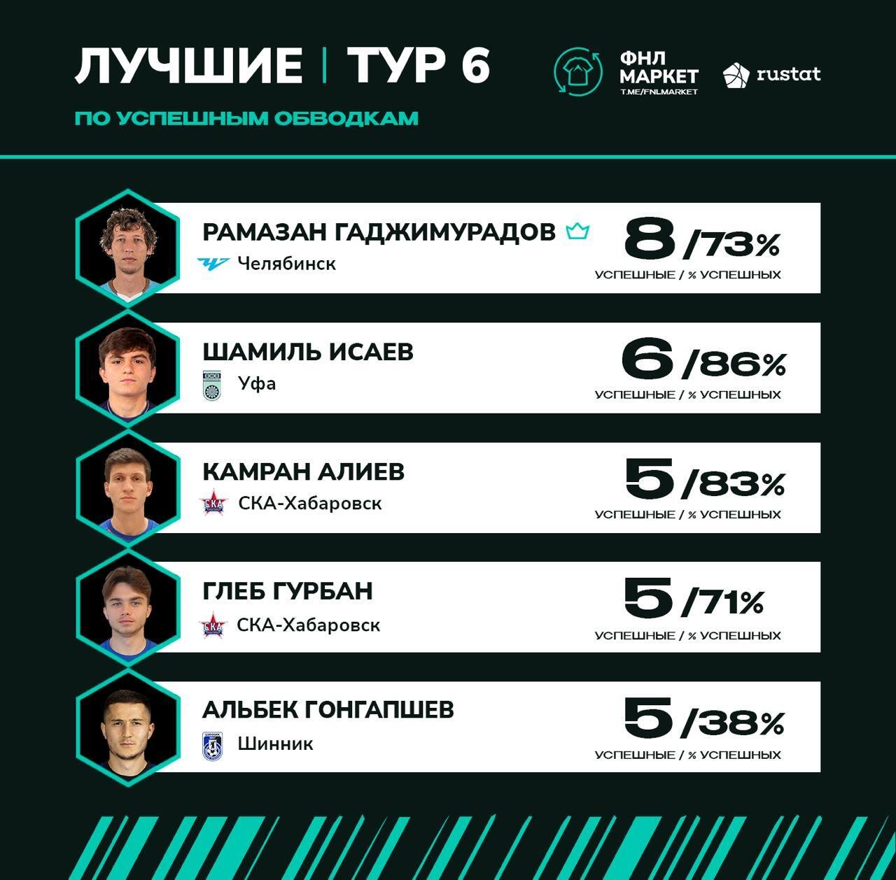 Его возглавил 27-летний полузащитник «Челябинска» Рамазан Гаджимурадов. В матче с саратовским «Соколом» он совершил восемь удачных действий. Второй показатель у Шамиля Исаева из «Уфы» — шесть обводок.