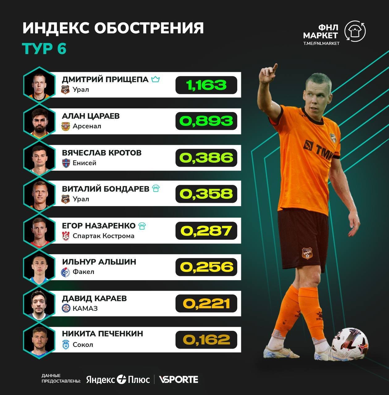 Футбольная национальная лига (ФНЛ) опубликовала рейтинг игроков Лиги PARI по индексу обострения после 6-го тура.