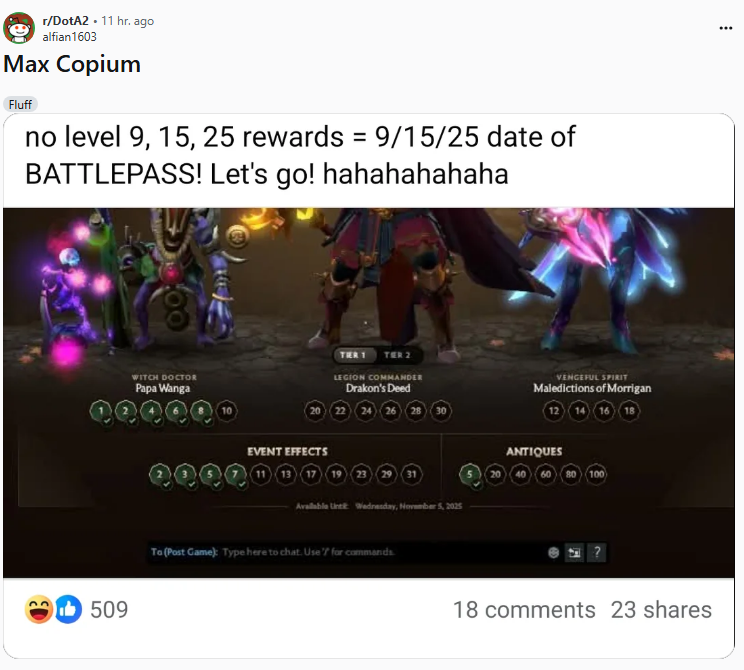 В новом событии отсутствуют награды за 9, 15 и 25 уровни. Это может быть намёком на следующую дату выхода патча – 15.09.2025. Примечательно, что это следующий день после окончания The International 2025, который завершится 14 сентября.