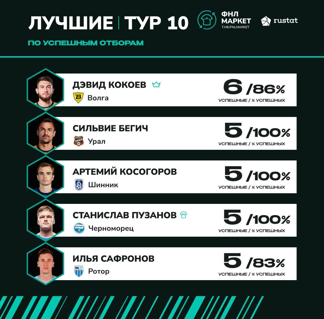 Футбольная национальная лига (ФНЛ) опубликовала рейтинг игроков десятого тура Лиги PARI по успешным отборам.
