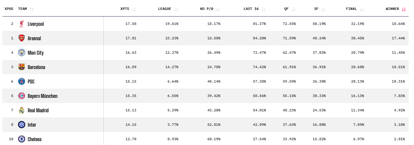 Cледом расположились «Арсенал» (17,44%) и «Манчестер Сити» (11,45%). Шансы алматинского «Кайрата» на победу в ЛЧ оцениваются в 0%, а на выход в четвертьфинальную стадию — в 0,02%.