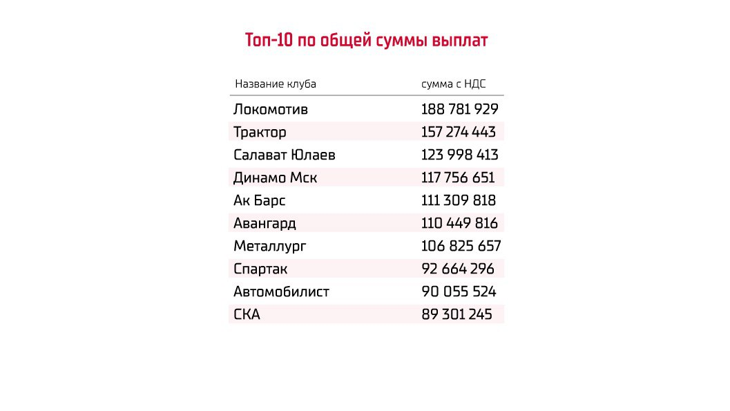 Наибольшую выплату получит «Локомотив» — 188,7 млн рублей с учётом налогов. Более 100 млн рублей заработают «Трактор» (157,2), «Салават Юлаев» (123,9), «Динамо» Москва (117,7), «Ак Барс» (111,3), «Авангард» (110,4) и «Металлург» (106,8).