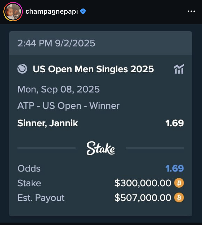 Рэпер Дрейк поставил 300 тыс долларов на победу Синнера на US Open-2025
