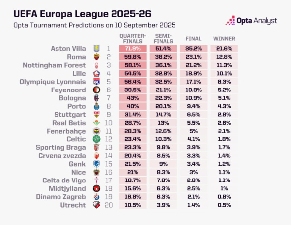По данным суперкомпьютера, «Астон Вилла» (21,6 %) является главным претендентом на победу в турнире. В тройку фаворитов также входят «Рома» (12,8%) и «Ноттингем Форест» (11,3%).
