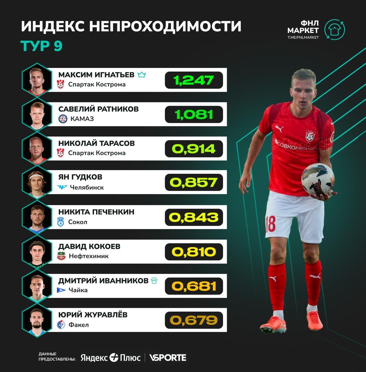 Футбольная национальная лига (ФНЛ) опубликовала рейтинг лучших игроков девятого тура Лиги PARI по индексу непроходимости.