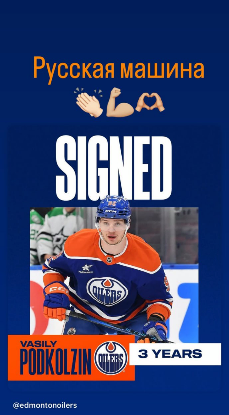 Нападающий «Эдмонтона» Леон Драйзайтль в социальных сетях поздравил российского одноклубника Василия Подколзина с подписанием нового трёхлетнего контракта, предусматривающего кэпхит в размере 2,95 миллиона долларов.