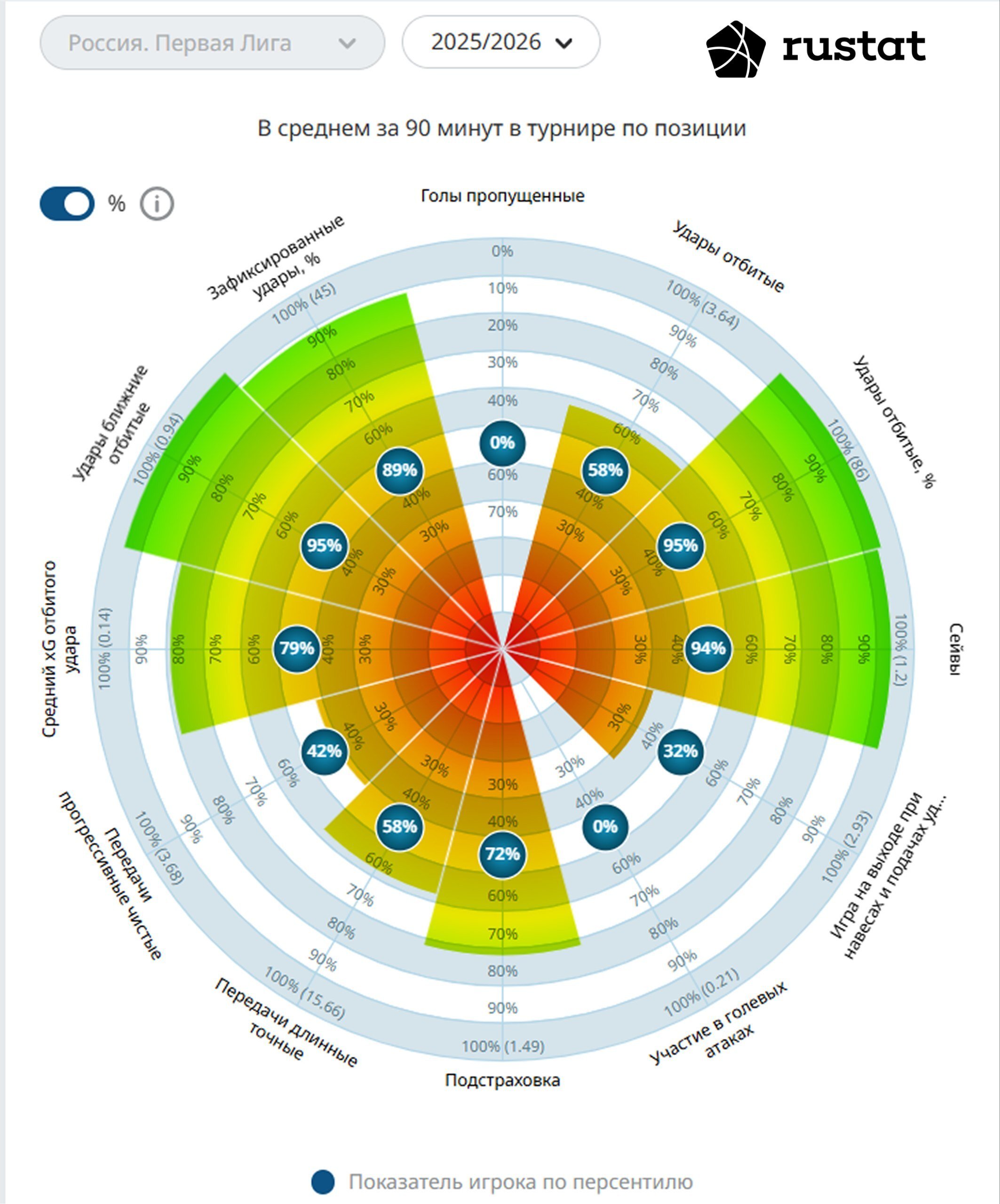 30-летний футболист сыграл 11 матчей, семь из которых провёл на ноль. Также Чагров лидирует по количеству сейвов (14), числу отбитых ближних ударов (11) и точным передачам рукой (52).