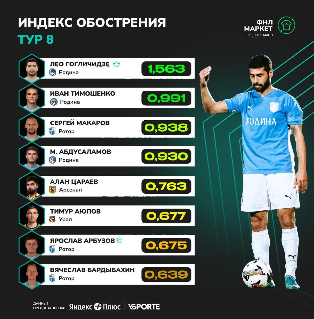 Первую строчку рейтинга занял защитник московской «Родины» Лео Гогличидзе — его показатель составил 1,563.