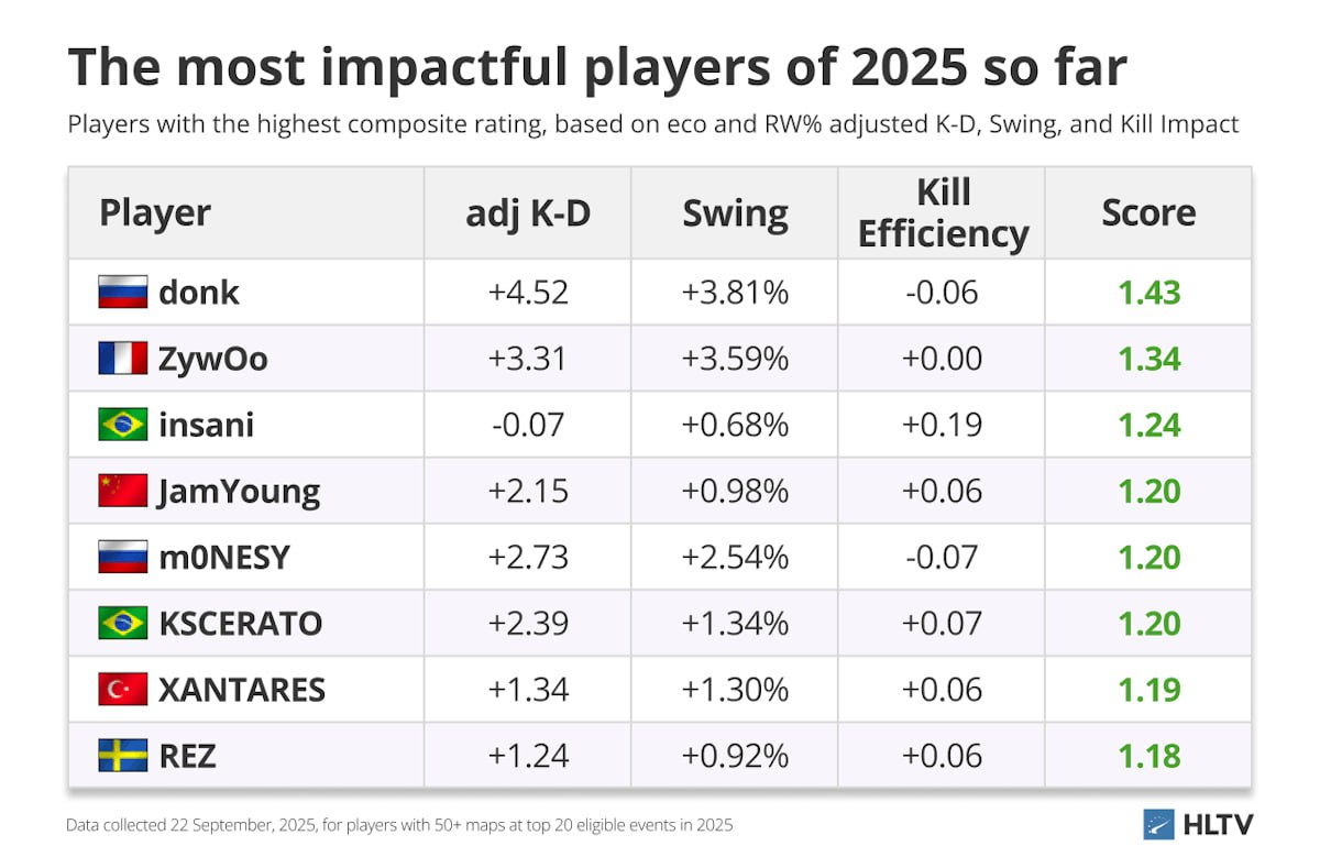 Все ключевые показатели подтверждают лидерство donk: россиянин — самый импактный игрок в CS2 с огромным отрывом от конкурентов. Аналитики не сомневаются, что по итогам текущего года Крышковец вновь заберёт заслуженное звание лучшего игрока в мире.
