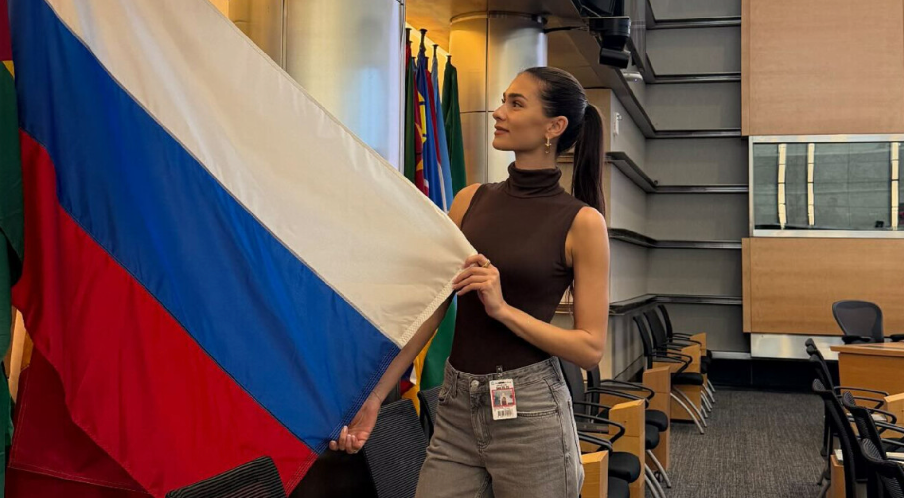 Анастасия Шубская, супруга российского нападающего и капитана «Вашингтона» Александра Овечкина, опубликовала фотографию с российским флагом, сделанную в штаб-квартире Всемирного банка в центре Вашингтона.