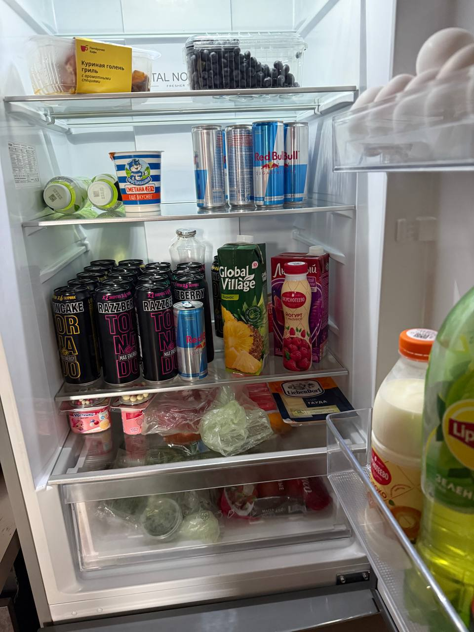 Первое, что бросается в глаза — это арсенал из 22 банок энергетиков, вытеснивших всё остальное. Среди немногочисленных «выживших» — пара йогуртов, куриная голень, сыр, базовые овощи, молоко и ягоды.