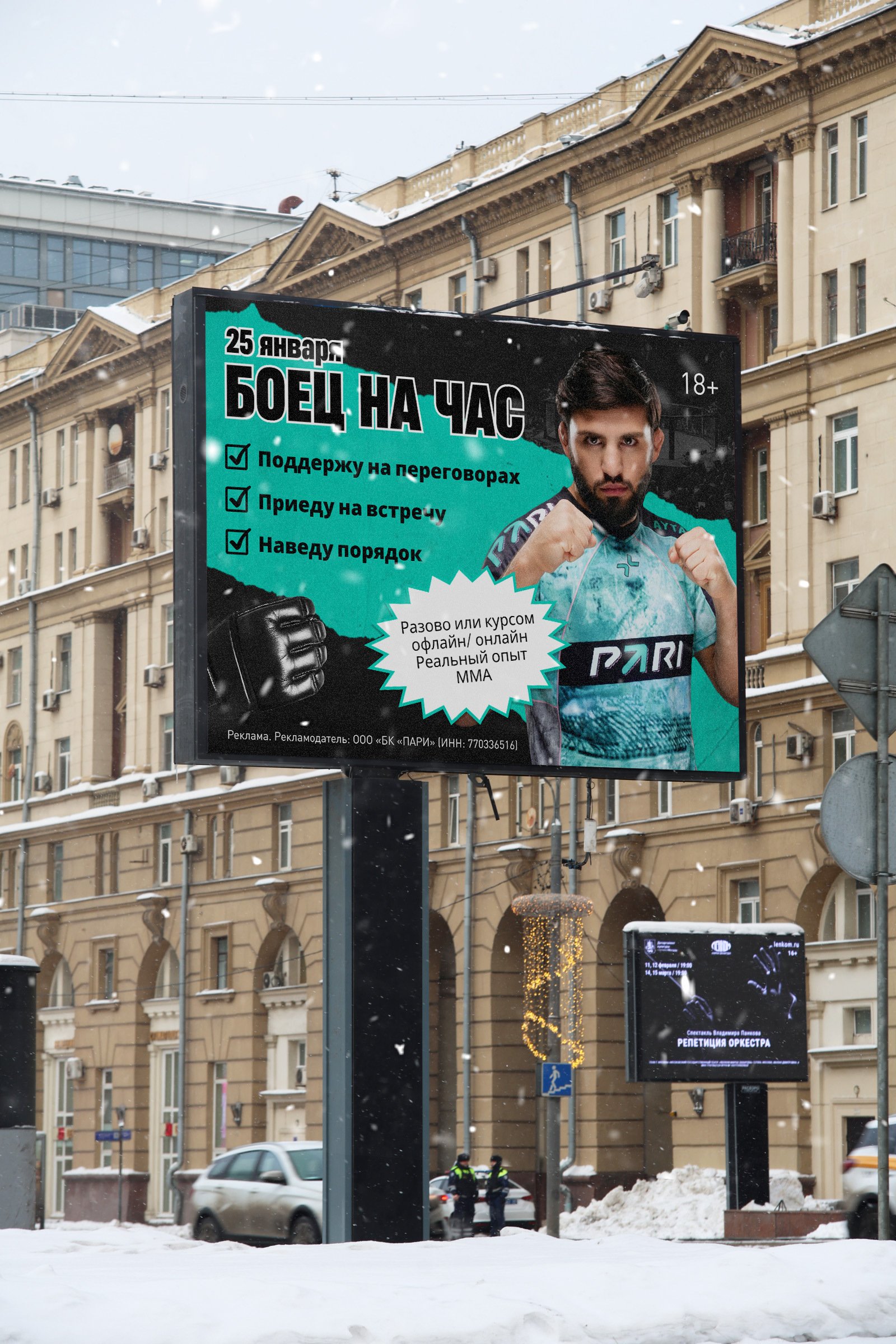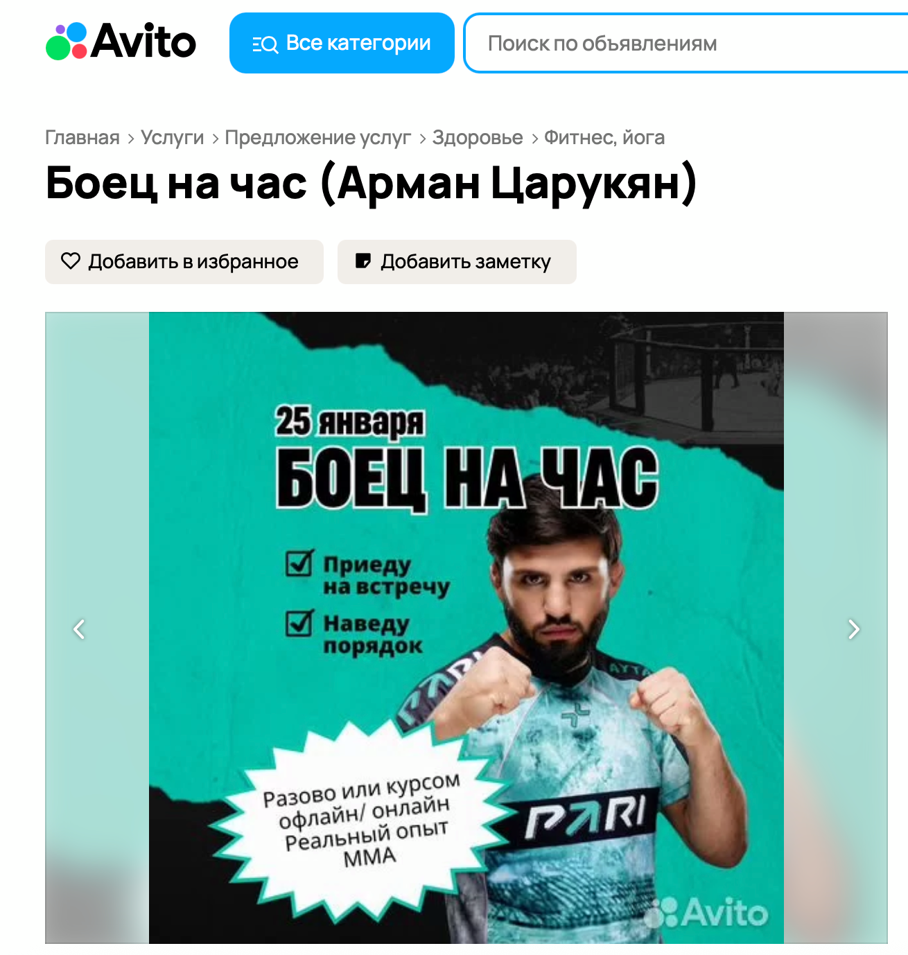 Букмекерская компания PARI решила помочь Царукяну в поиске подходящей подработки. Актуальные объявления с его услугами уже размещены на сайтах Профи. Ру и Авито. Для большего охвата также была задействована наружная реклама. Предложение «Боец на час» ограничено и будет действовать только 25 января.