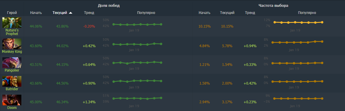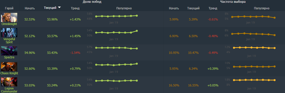 Лучшим же персонажем пока что является Omniknight с винрейтом 53.14%, разделяя верхние позиции рейтинга с Vengeful Spirit и Spectre. Omniknight демонстрирует стабильно высокую эффективность, особенно на позиции оффлейнера.
