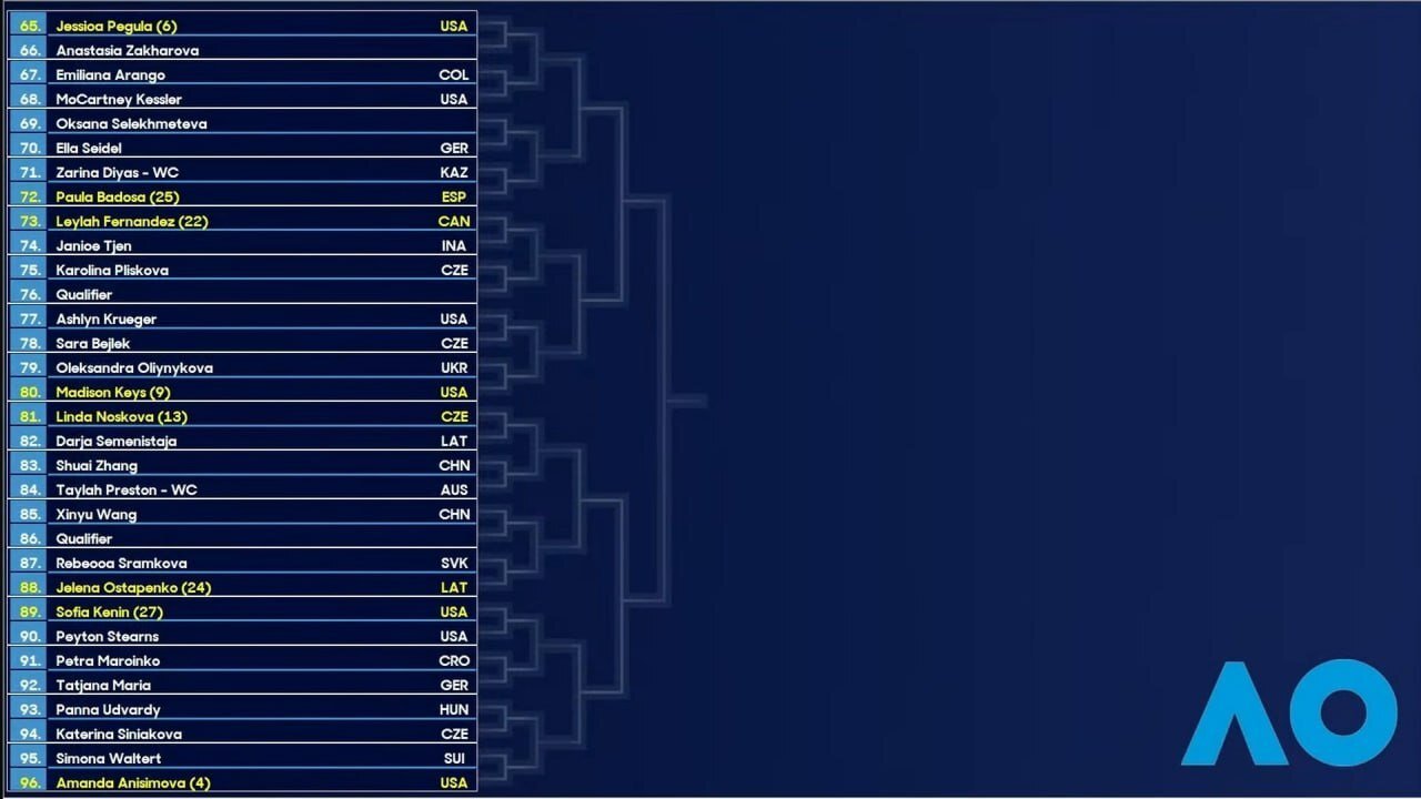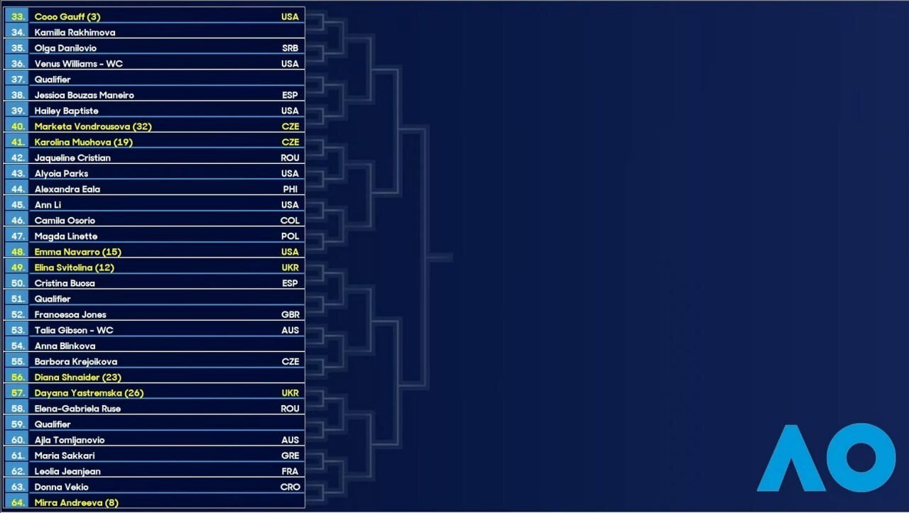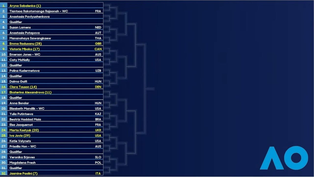 Соперницей первой ракетки мира белоруски Арины Соболенко станет француженка Тьянцоа Ракотоманга Райаона. Пятый номер рейтинга WTA Елена Рыбакина из Казахстана встретится с Кайей Юван из Словении.