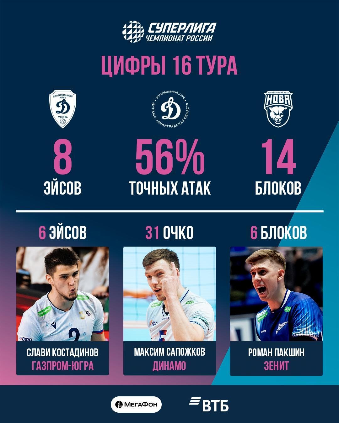 Бело-голубые во встрече с казанским клубом также совершили восемь эйсов, что стало лучшим результатом по этому показателю. При этом связующий «Газпрома-Югры» Слави Костадинов занял первое место по результативным подачам среди игроков, совершив шесть эйсов в матче с «Енисеем». Лучшим по успешным блокам стал доигровщик «Зенита» Роман Пакшин, набравший на блоке шесть очков.