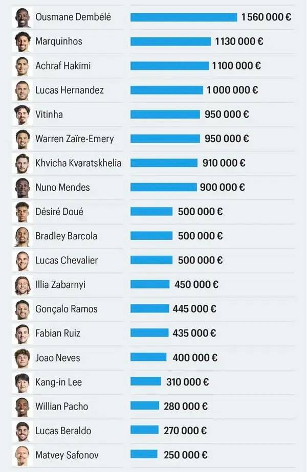 Зарплата Сафонова оказалась почти в четыре раза меньше, чем у грузинского полузащитника Хвичи Кварацхелии (910 тысяч евро). Голкипер Люка Шевалье зарабатывает вдвое больше Сафонова — 500 тысяч евро в месяц. Самым высокооплачиваемым игроком в опубликованном списке стал Усман Дембеле с 1,56 млн евро.