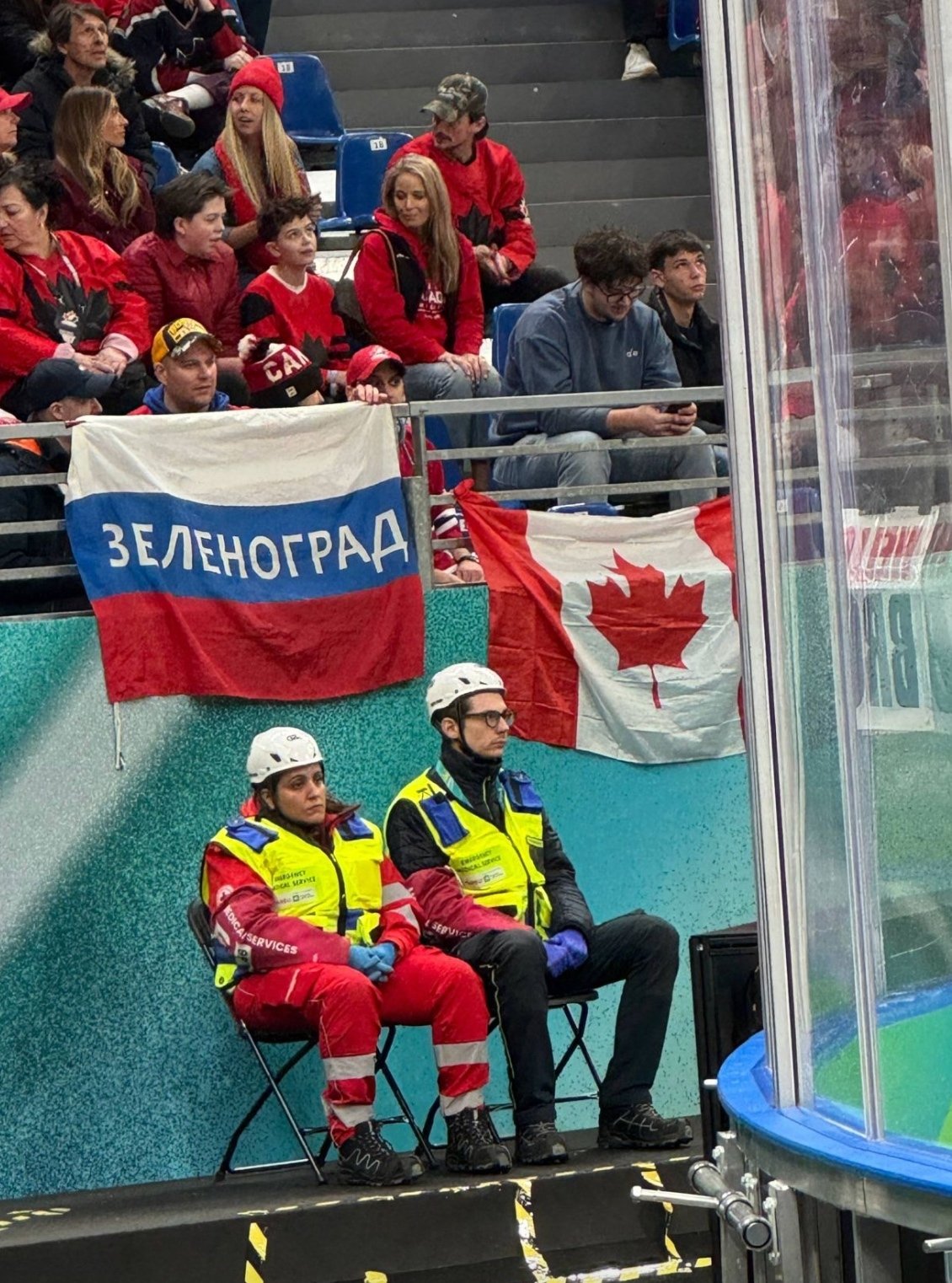 Флаг России с надписью «Зеленоград» вывесили на трибунах во время матча Канады на Олимпиаде