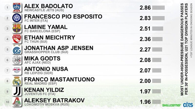 Батраков набрал 1,96 балла по этому показателю. Российский игрок замкнул десятку, уступив лидеру Алексу Бадолато из «Ньюкасл Джетс» (2,86 балла) и второму месту — нападающему «Интера» Франческо Эспозито (2,83). В тройку лучших также вошёл форвард «Барселоны» Ламин Ямаль (2,51).