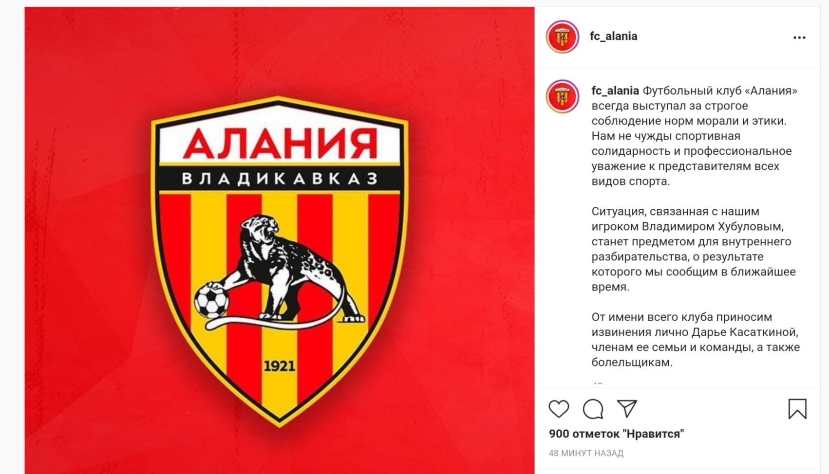 «Футбольный клуб «Алания» всегда выступал за строгое соблюдение норм морали и этики. Нам не чужды спортивная солидарность и профессиональное уважение к представителям всех видов спорта. От имени всего клуба приносим извинения лично Дарье Касаткиной, членам её семьи и команды, а также болельщикам», — говорится в заявлении.