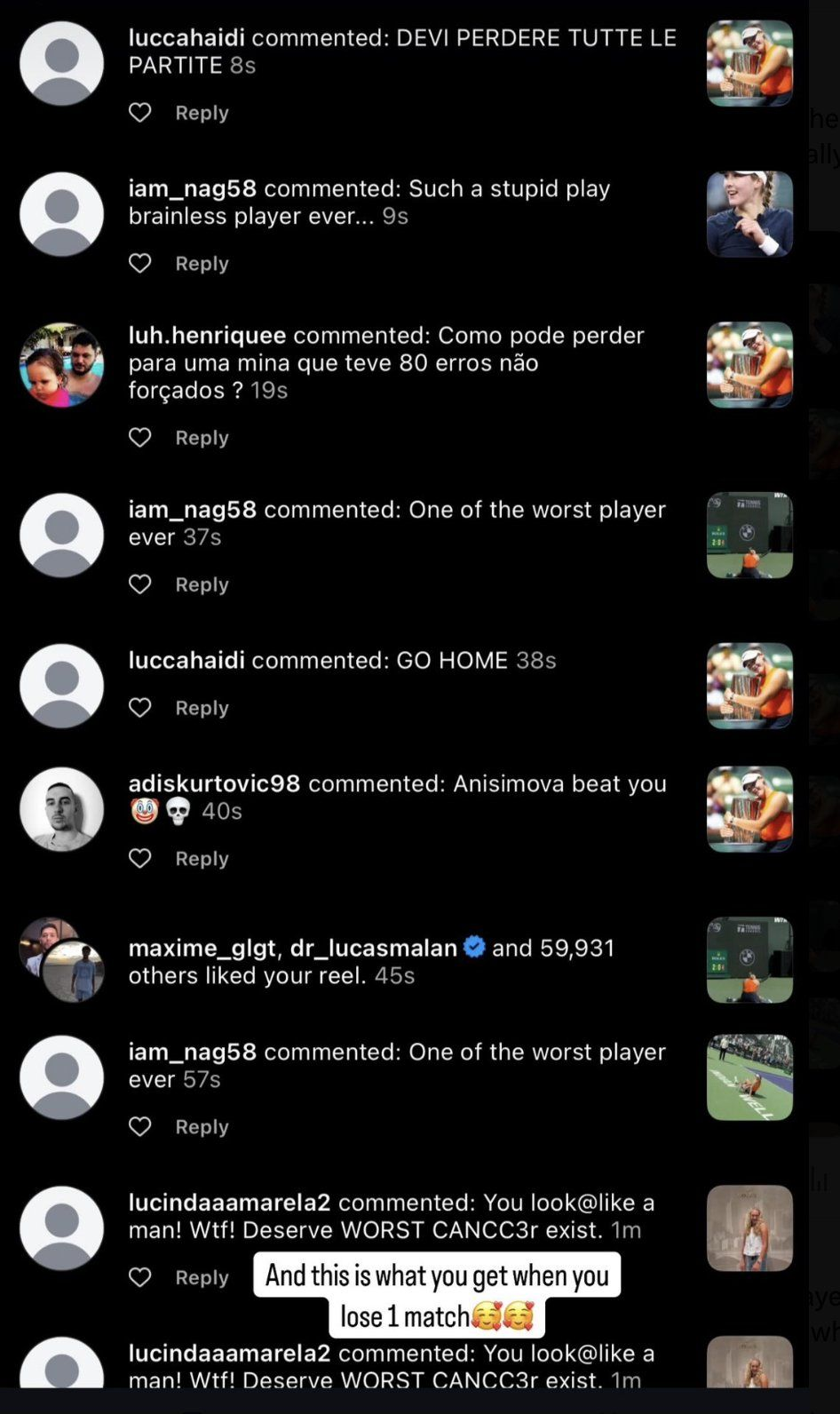 Андреева показала оскорбительные комментарии болельщиков в свой адрес после поражения в Майами
