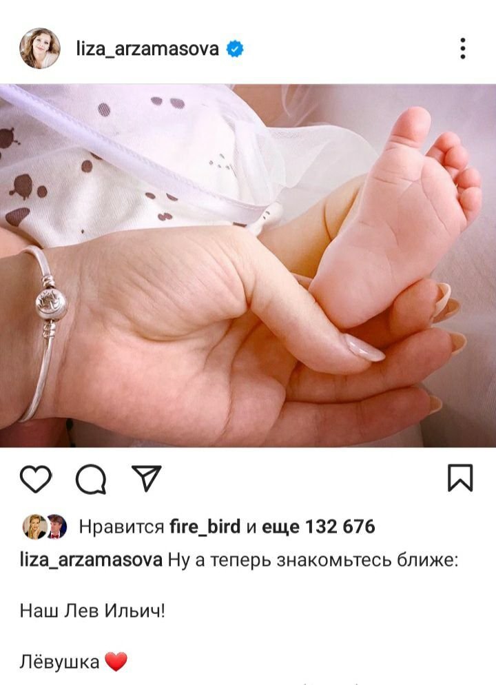 Звезда сериала «Папины дочки» Елизавета Арзамасова у себя в «Инстаграме»* назвала имя новорождённого сына от олимпийского призёра и хореографа Ильи Авербуха. Мальчика назвали Лев.