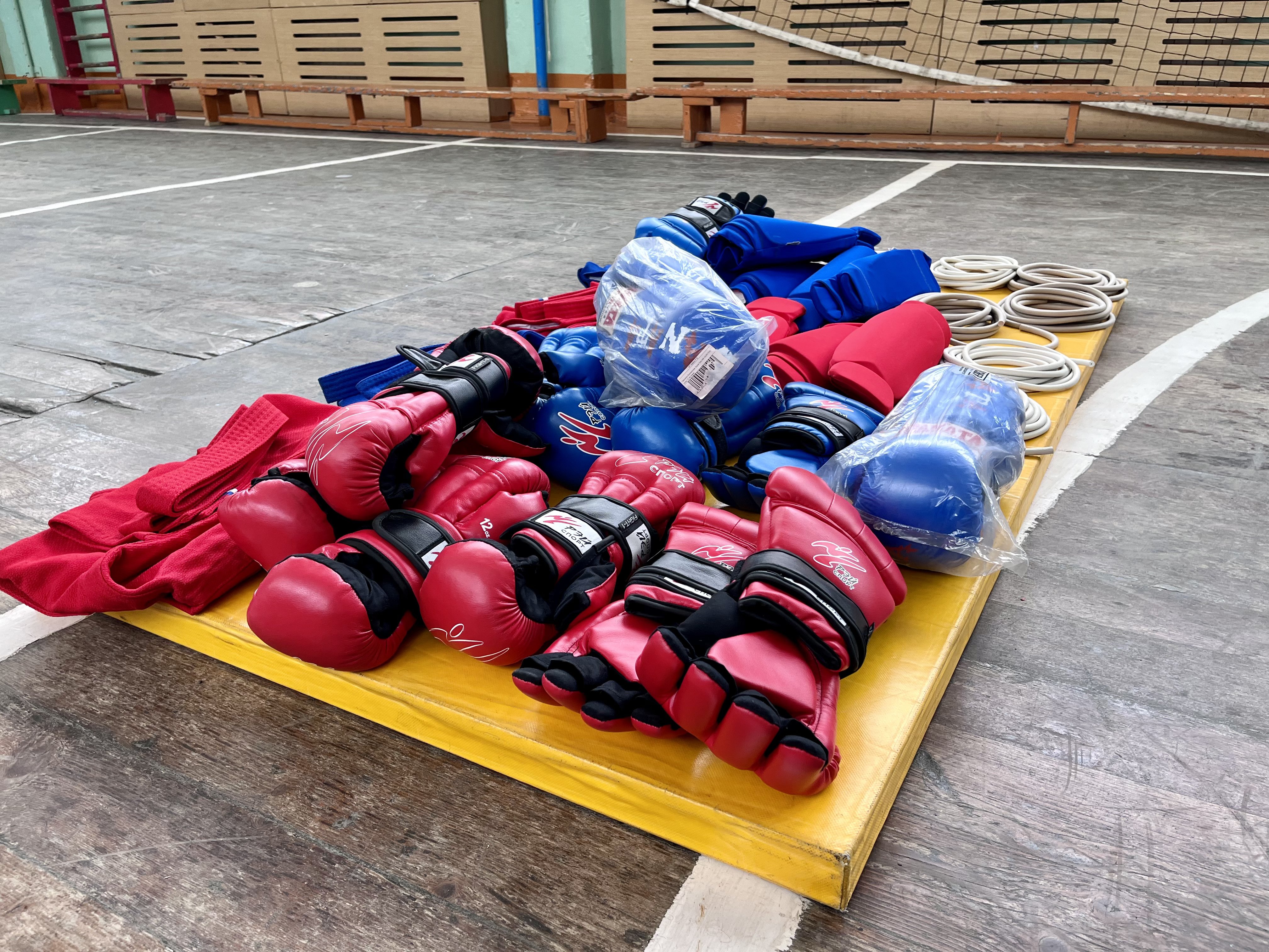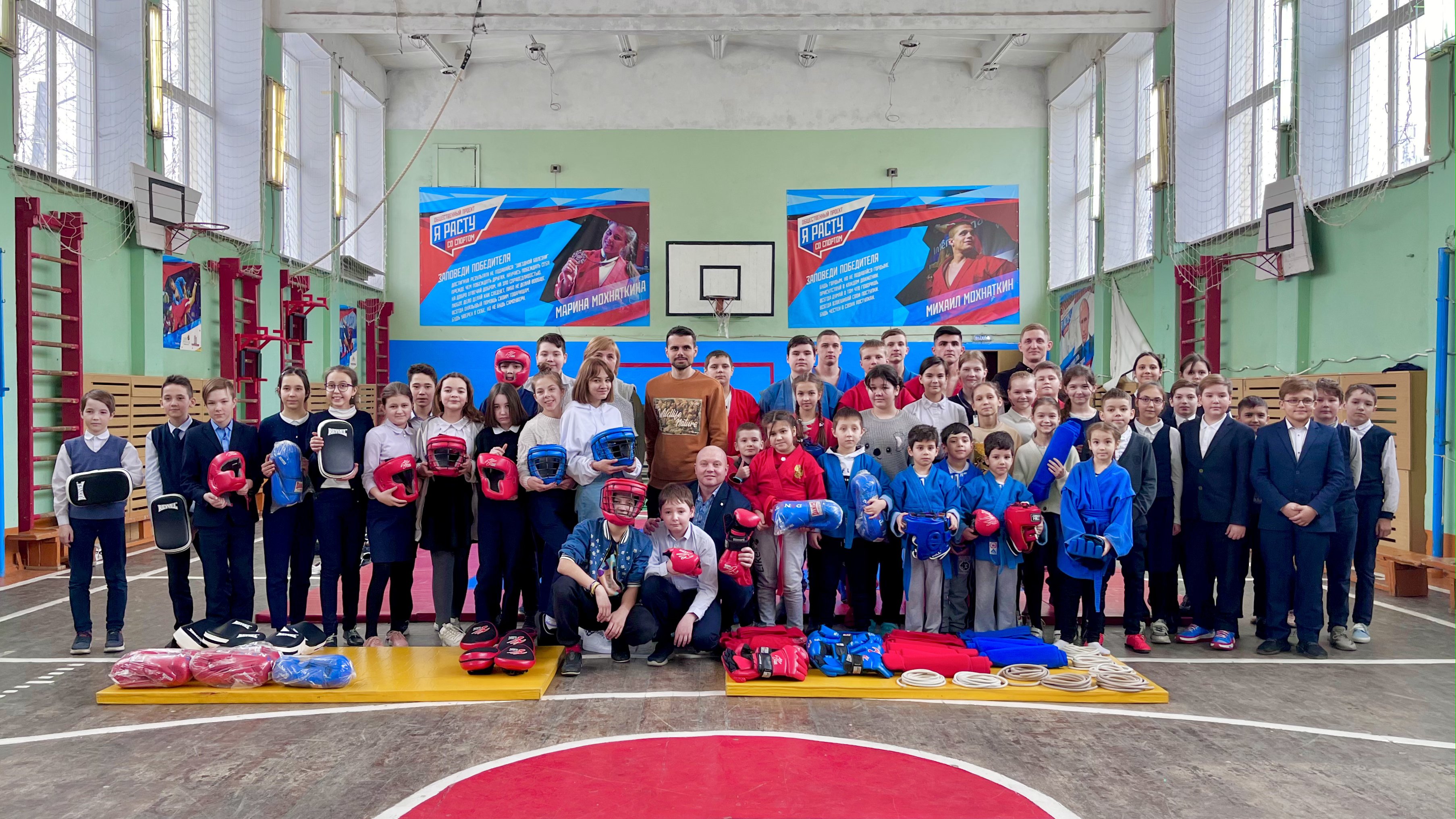 Школьникам подарили шлемы, куртки, жилеты для занятий единоборствами, гири, скакалки, перчатки для бокса и рукопашного боя, а также помогли обустроить спортивный зал. Во время вручения спортивного инвентаря ученики показали мастер-класс по самбо на новых матах.