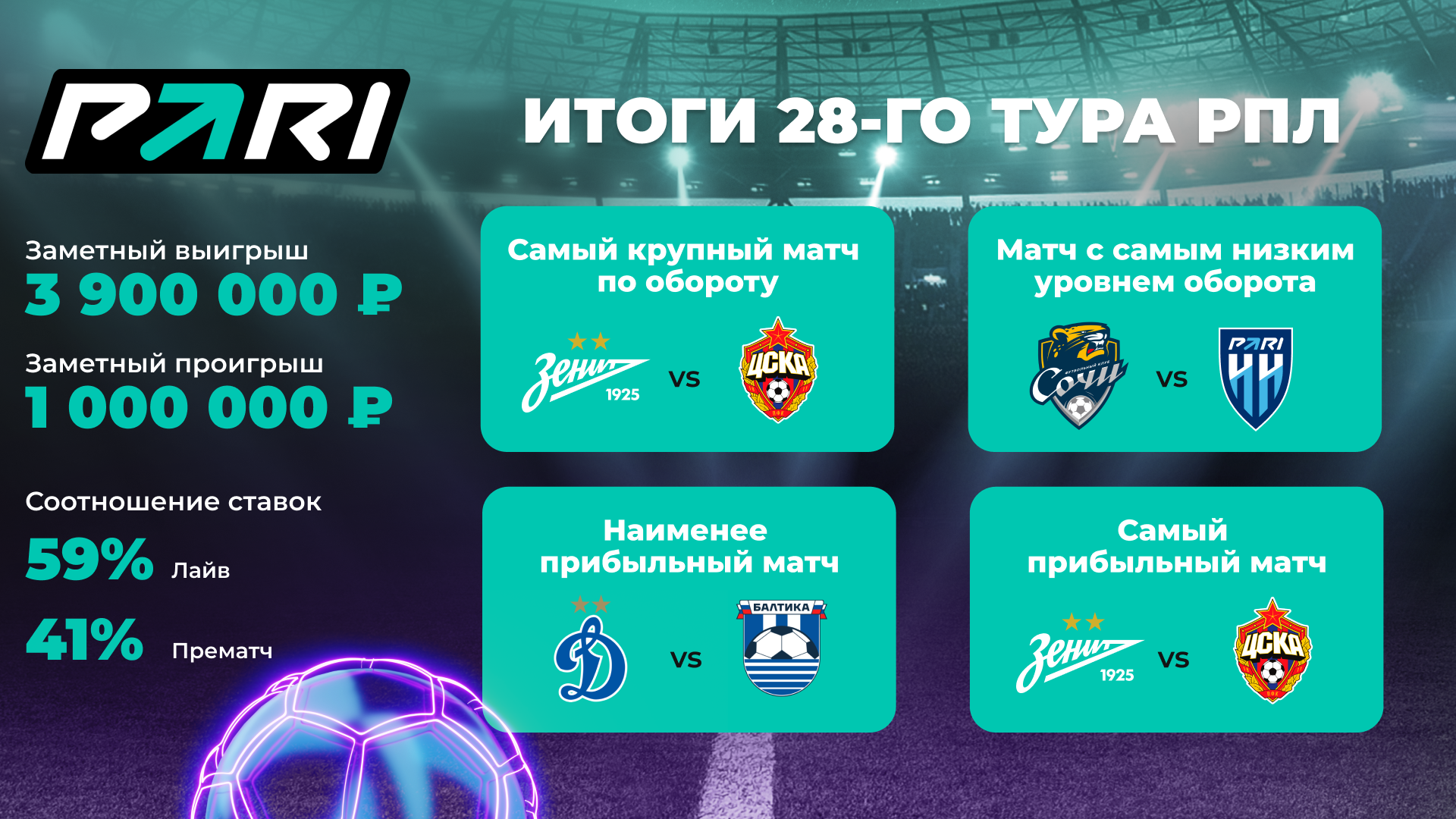 Самыми удачными для компании оказались матчи «Зенит» — ЦСКА, «Спартак» — «Краснодар» и «Факел» — «Урал». Самой прибыльной стала игра на «Газпром-Арене» — на нее пришлось 18% от общей доли прибыли за весь тур. В свою очередь клиенты PARI удачно прогнозировали ход событий в матчах «Балтика» — «Динамо», «Оренбург» — «Локомотив» (0:2) и «Сочи» — «Пари НН».
