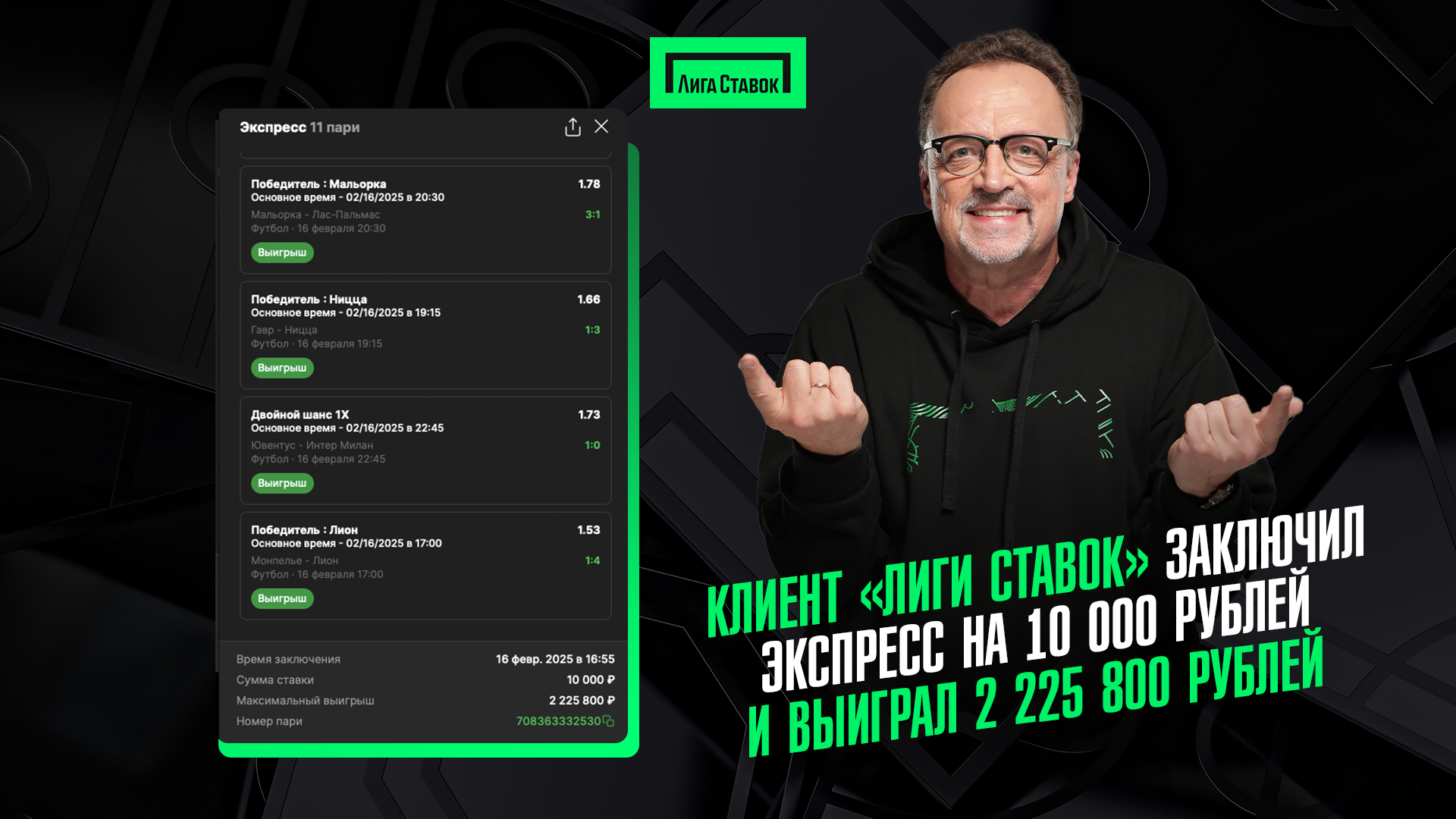 В воскресенье, 16 февраля, игрок «Лиги Ставок» составил из 11 футбольный матчей европейских чемпионатов. Сумма ставки — 10 000 рублей. Коэффициент — 222,57. А итоговый выигрыш — 2 225 800 рублей.