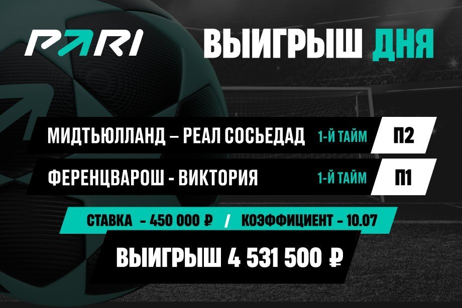 Игрок поставил 450 000 рублей, собрав экспресс из матчей «Мидтьюлланн» — «Реал Сосьедад» и «Ференцварош» — «Виктория Пльзень». В первой встрече он выбрал победу гостей в первом тайме за 3.05, а во второй сделал аналогичную ставку на хозяев поля за 3.30. Суммарный коэффициент купона составил 10.07.