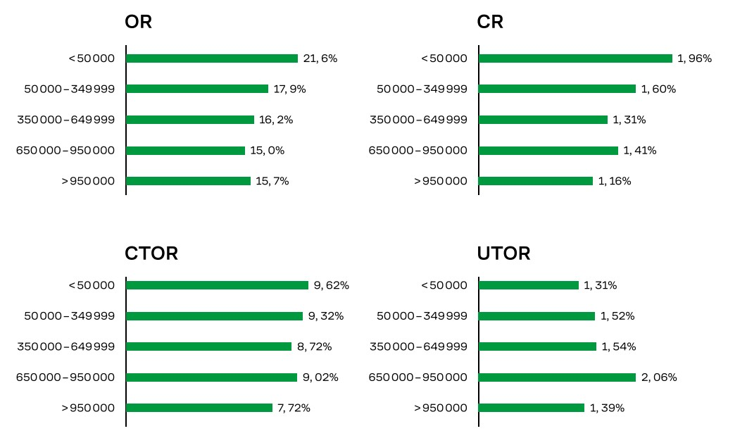 При этом сохраняется тенденция: чем больше бизнес, тем сложнее увеличивать показатели e-mail-рассылок. Практически по всем анализируемым критериям с увеличением числа клиентов, которым отправлялись сообщения, наблюдается падение. Исключение — клики на отписку.