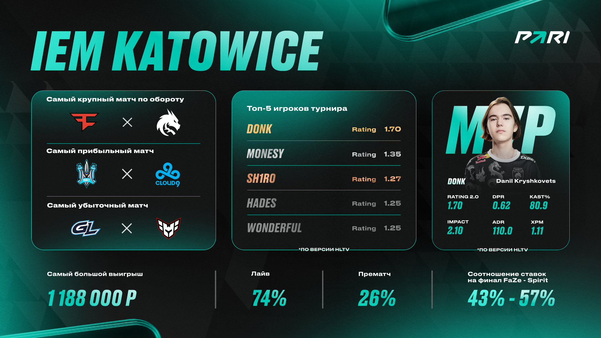 Турнир наверняка запомнится фанатам феноменальным выступлением молодого donk — звезды Team Spirit. 17-летний российский киберспортсмен получил награду лучшего игрока чемпионата, а его средний рейтинг составил фантастические 1.70. Букмекерская компания PARI поделилась информацией о самых прибыльных и убыточных для компании и клиентов матчах турнира.