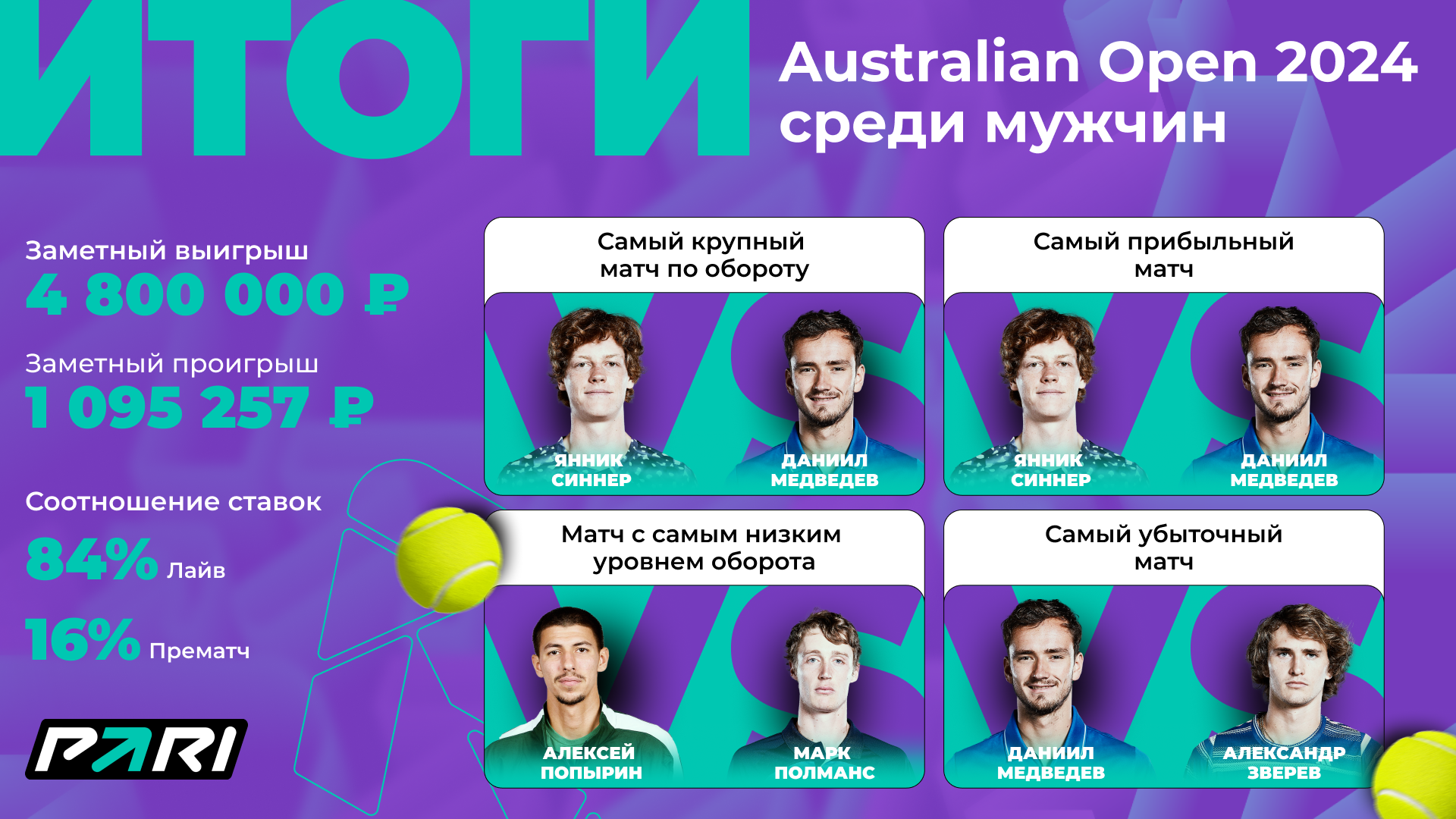 Самым удачным для PARI событием турнира стал финальный матч между Медведевым и Синнером. На этой встрече компания получила более 8% всей прибыли по итогам приема ставок на Australian Open среди мужчин. В пятерку наиболее прибыльных матчей также вошли игры Зверев — Алькарас, Джокович — Синнер, Хольгер Руне — Артур Казо и Адриан Маннарино — Бен Шелтон. Для клиентов PARI самой выигрышной оказалась встреча Медведева и Зверева в полуфинале турнира. Она растянулась на пять сетов. При этом немец взял первые два сета, а в третьем и четвертом судьба матча решалась на тай-брейке.