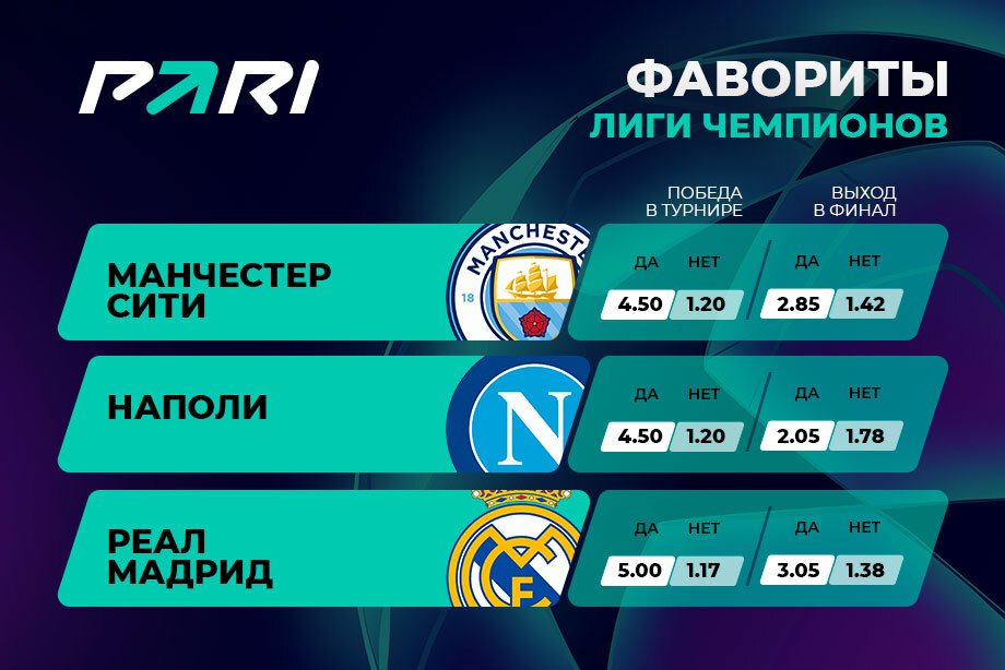 «Манчестер Сити» остается одним из главных фаворитов Лиги чемпионов в сезоне-2022/23, но теперь не единоличным. Аналитики PARI убедились в том, что лидер текущего сезона в чемпионате Италии «Наполи» способен замахнуться и на международный трофей. Неаполитанцы уверенно прошли «Айнтрахт» из Франкфурта в 1/8 финала ЛЧ, обыграв соперника с общим счетом 5:0. Что касается подопечных Хосепа Гвардиолы, то они сначала сыграли вничью с «Лейпцигом», а затем катком прошлись по немецкой команде, раздавив ее со счетом 7:0. Сделать ставку на триумф «Манчестер Сити» или «Наполи» в турнире можно по коэффициенту 4.50. Любопытно, что шансы итальянской команды выйти в финал оцениваются повыше. Если неаполитанцы окажутся среди финалистов, сыграет коэффициент 2.05. Ставки на появление «Манчестер Сити» в финале принимаются за 2.85.