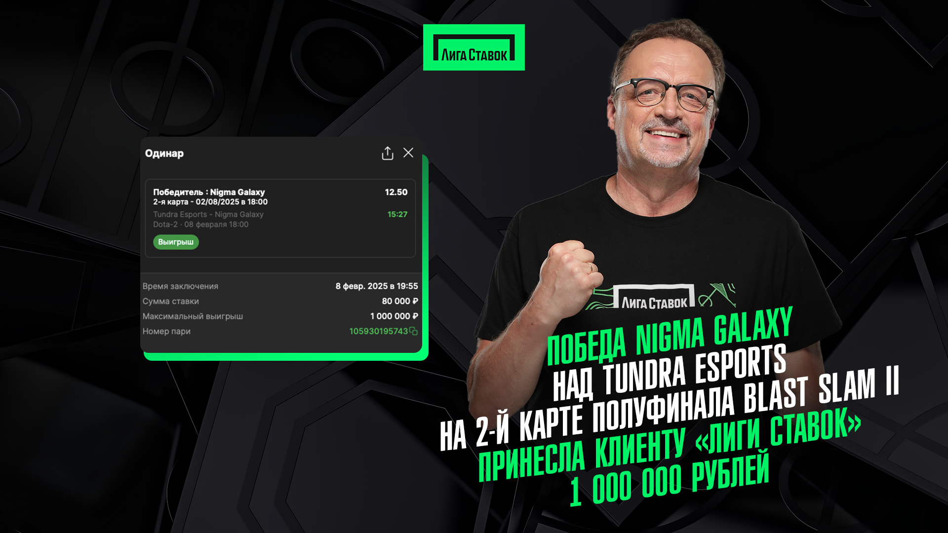 Победа Nigma Galaxy над Tundra Esports на 2-й карте полуфинала BLAST Slam II принесла клиенту «Лиги Ставок» 1 000 000 рублей
