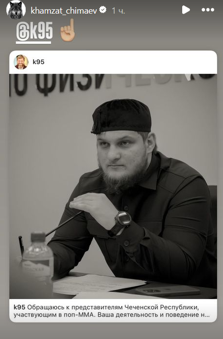 На странице в соцсетях Чимаев прокомментировал слова сына Рамзана Кадырова смайлом в виде указательного пальца вверх.