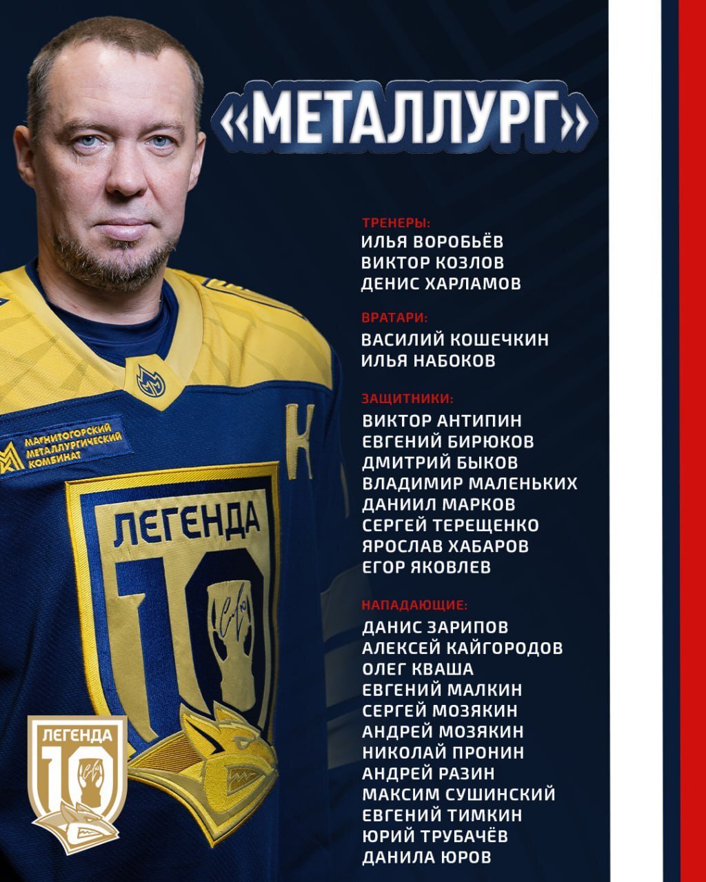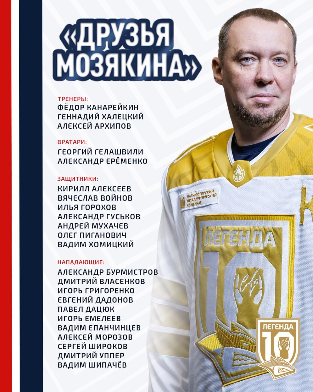 Магнитогорский «Металлург» в официальном телеграм-канале представил составы команд на прощальном матче легендарного нападающего «Магнитки» Сергея Мозякина.