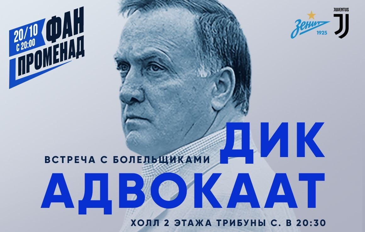 Пресс-служба петербургского «Зенита» сообщила, что перед матчем Лиги чемпионов против «Ювентуса» состоится встреча болельщиков с бывшим главным тренером сине-бело-голубых Диком Адвокатом.