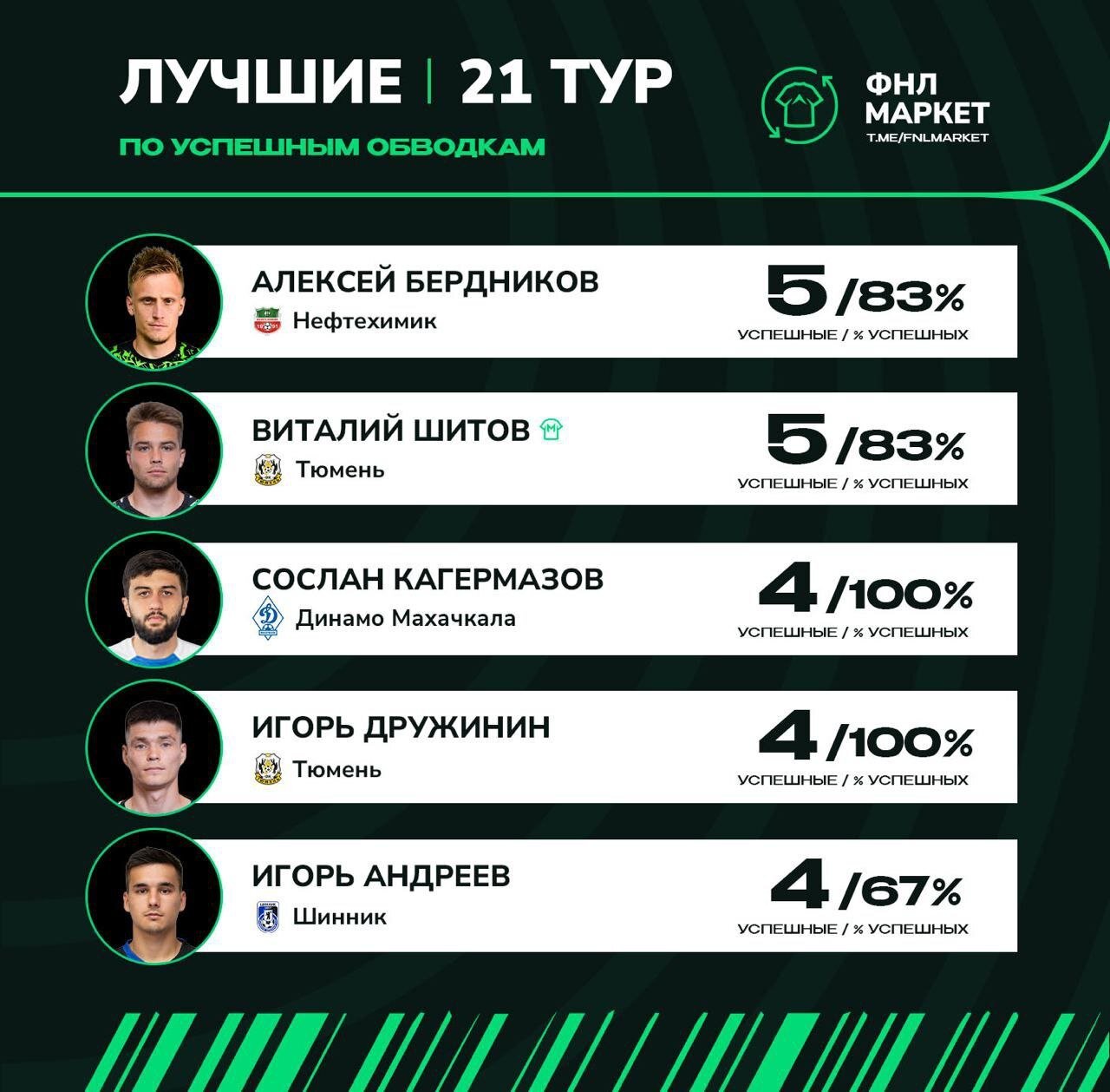 Полузащитники Виталий Шитов (5 успешных обводок, 83% успешных) и Игорь Дружинин (4 обводки, 100% успешных) были включены в топ-5 рейтинга.