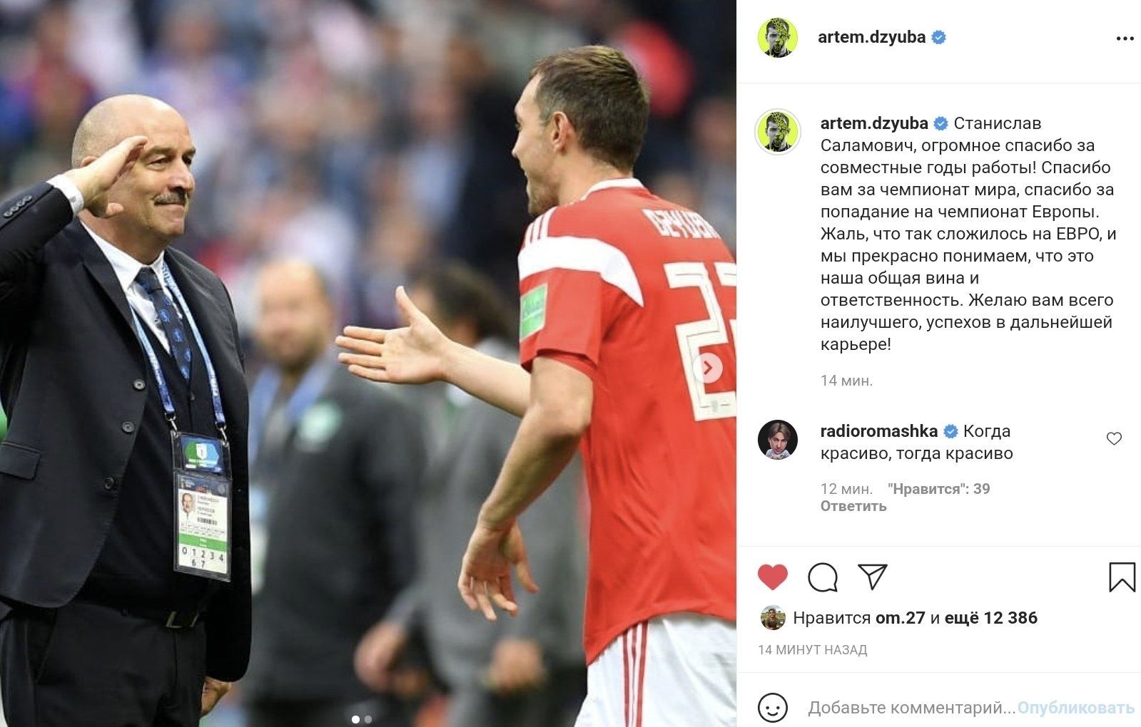 «Станислав Саламович, огромное спасибо за совместные годы работы! Спасибо вам за чемпионат мира, спасибо за попадание на чемпионат Европы. Жаль, что так сложилось на Евро. Мы прекрасно понимаем, что это наша общая вина и ответственность. Желаю вам всего наилучшего, успехов в дальнейшей карьере», — написал футболист.