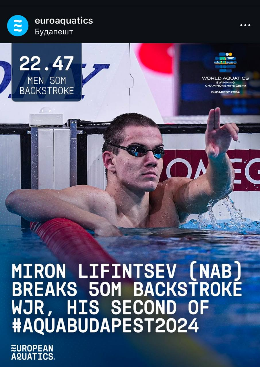 Европейская федерация водных видов спорта (European Aquatics) опубликовала пост о победе россиянина Мирона Лифинцева на чемпионате мира по плаванию на короткой воде в Будапеште.