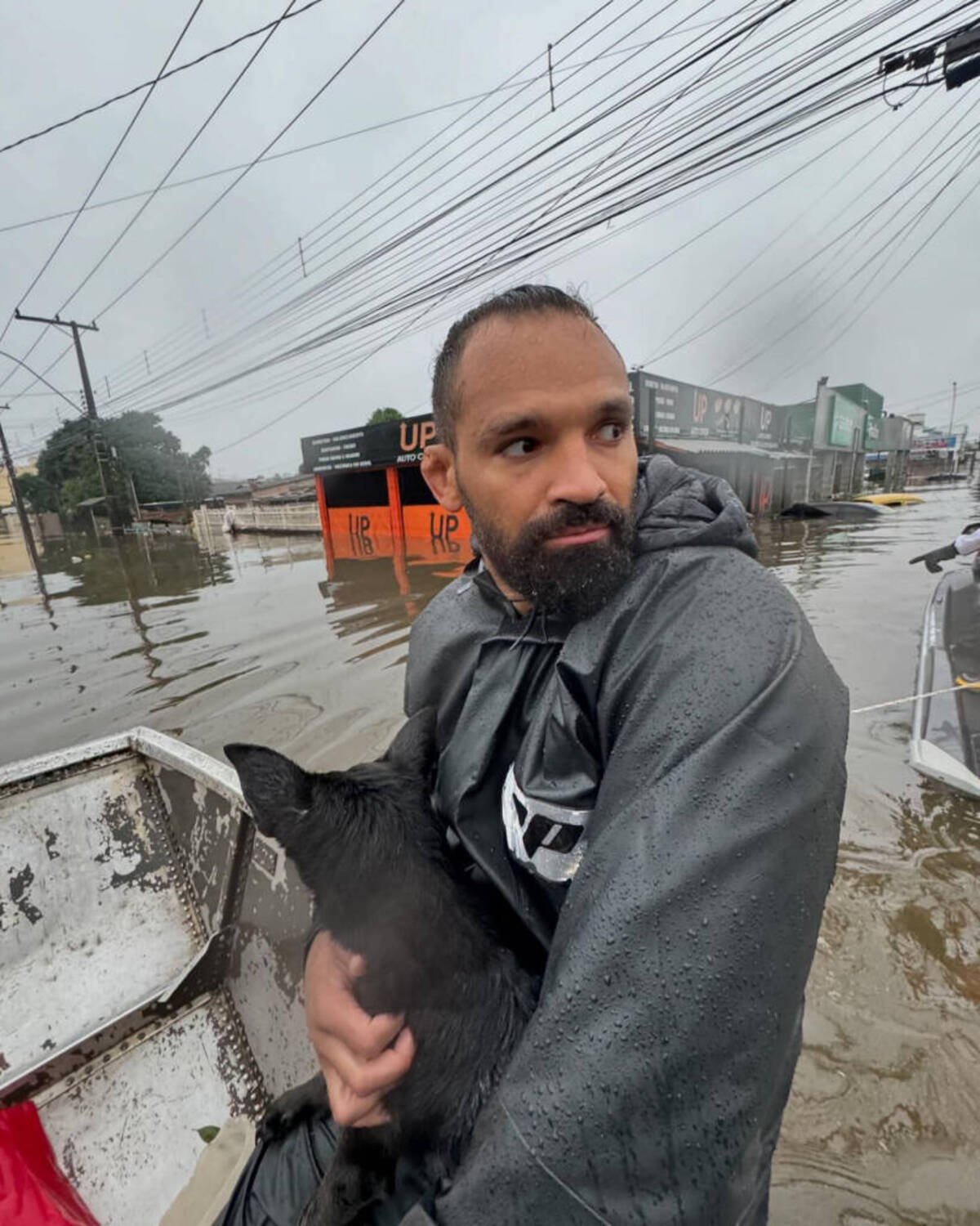 Фото: боец UFC Перейра помогает спасать домашних животных в зоне наводнения в Бразилии