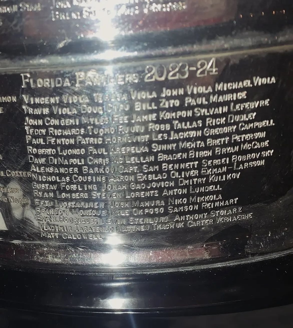 Имена хоккеистов «Флориды Пантерс», среди которых есть россияне Владимир Тарасенко, Дмитрий Куликов и Сергей Бобровский, нанесли на Кубок Стэнли-2024.