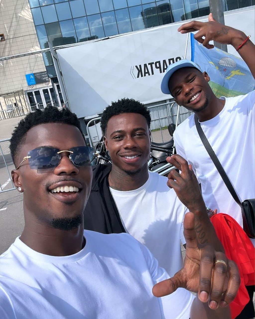 Игроки московского «Спартака» Кейта Бальде, Квинси Промес и Кристофер Мартинс сфотографировались на фоне флага Воздушно-десантных войск (ВДВ). Снимок опубликован в официальном телеграм-канале красно-белых.