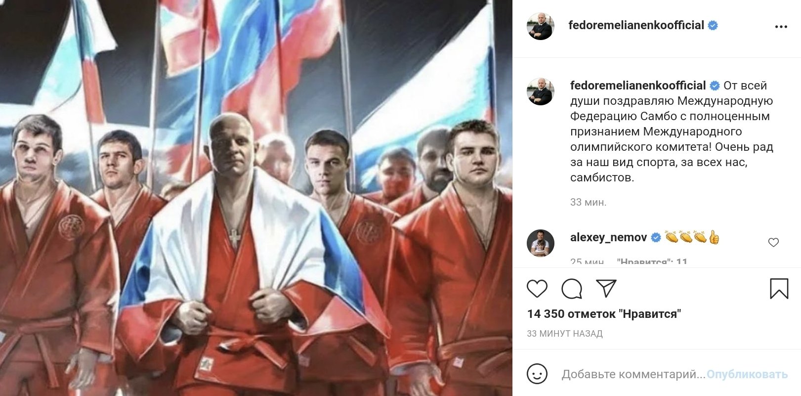 Известный боец ММА Фёдор Емельяненко опубликовал новый пост в «Инстаграме»*, где поздравил самбистов с признанием МОК.
