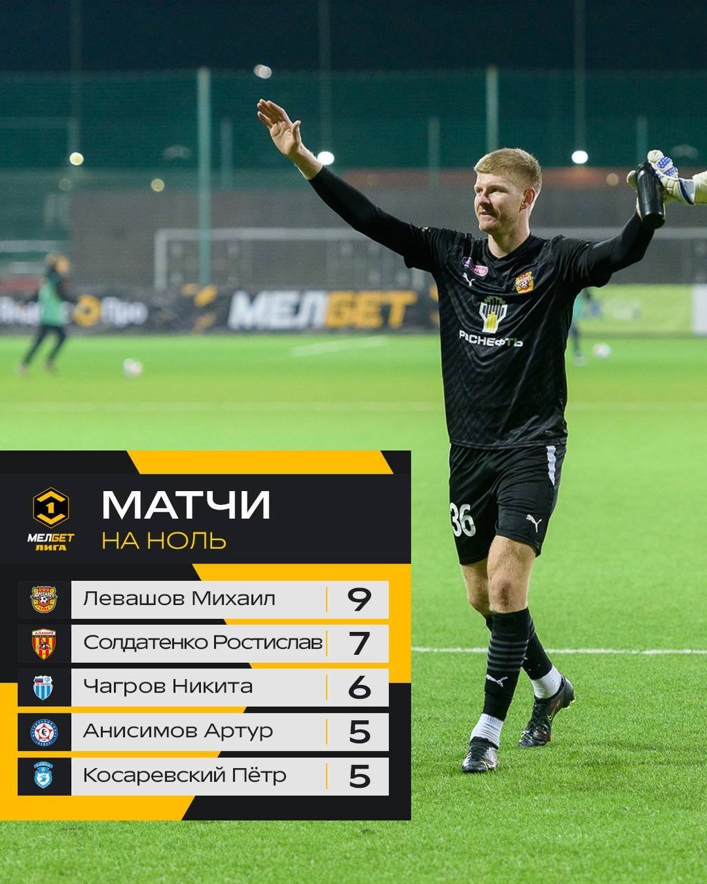 Второе место занимает Ростислав Солдатенко («Алания) — 7, третье Никита Чагров («Ротор») — 6. По пять сухих матчей в активе у Петра Косаревского («Сокол») и Артура Анисимова («КАМАЗ»).