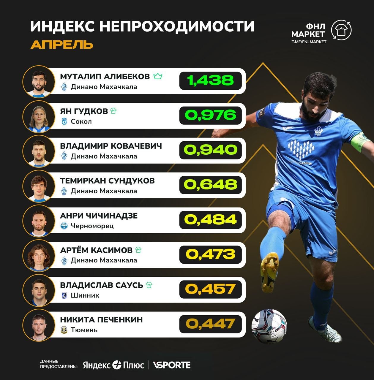 Индекс непроходимости футболиста составил 0,457. В прошлом месяце 20-летний хавбек сыграл в пяти матчах Первой лиги.