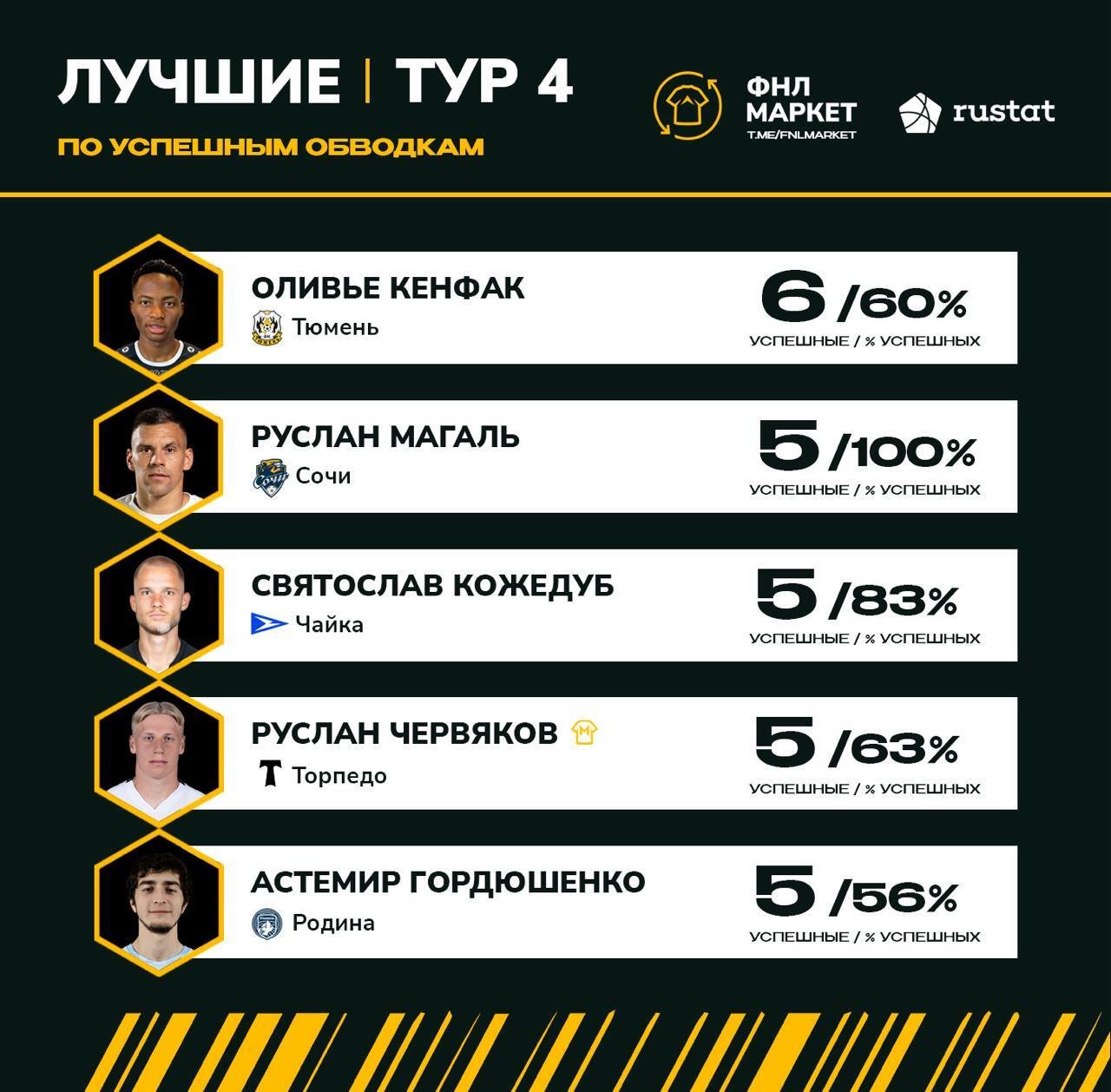 Полузащитник «Тюмени» Оливье Кенфак стал лучшим по успешным обводкам в четвёртом туре Мелбет-Первой лиги. Об этом сообщил телеграм-канал «ФНЛ Маркет».