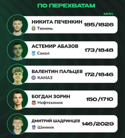 Игрок «Шиннка» вошёл в пятёрку лучших футболистов по перехватам после первой части сезона ФНЛ